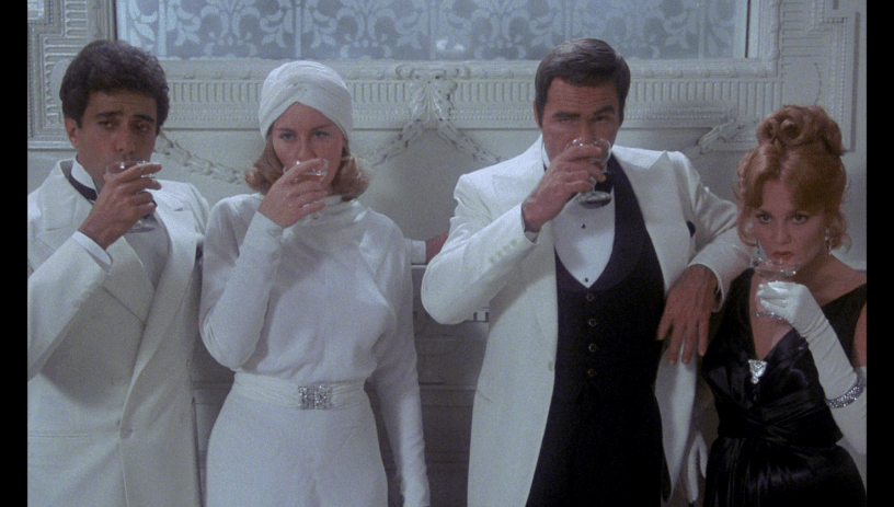 The film plays like a screwball comedy, with quick dialogue, and snappy comebacks. Reynolds and Shepherd are especially good at this kind of dialogue, but Madeline Kahn has a background in comedy and Del Prete is capable as well. The film has a fun time with these relationships, and even adds an additional relationship with Brooke’s maid pursuing Michael’s butler. One of the best musical numbers in the film happens between them, the call and response song “But in the Morning No.” This song plays as their theme, and returns over and over in the film, but is never unwelcome.