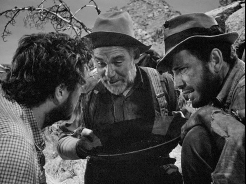 As they go out on the trail, Dobbs and Curtin, who earlier had questioned whether Howard could keep up with them, find out just how unprepared they are. They can barely make a day’s walk, and Howard is running ahead of them, climbing hills and running back down to guide them. They also find out how little they know when Dobbs is certain he’s found gold. He and Curtin yell excitedly and call for Howard. But Howard knows it’s just pyrite, fool’s gold. A rock that glitters like gold, but has none of the other valuable properties of gold.