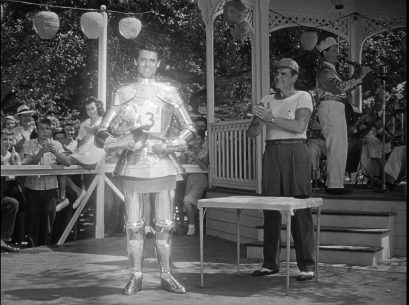 His next move is when things get fun. He decides that rather than be the sophisticated grownup that Susan is smitten with, he will act like the teenager that she’s normally surrounded by. He borrows Jerry’s jalopy, messes up his clothes, and starts reveling in his recaptured youth. Seeing Cary Grant act like a teenager, matching Shirley Temple move for move is true, unadulterated joy. He goes with the whole family to a picnic with various events. He starts competing in the events, trying to win against Tommy the ADA. He ends up losing event after event and gets competitive, finally winning the final event.