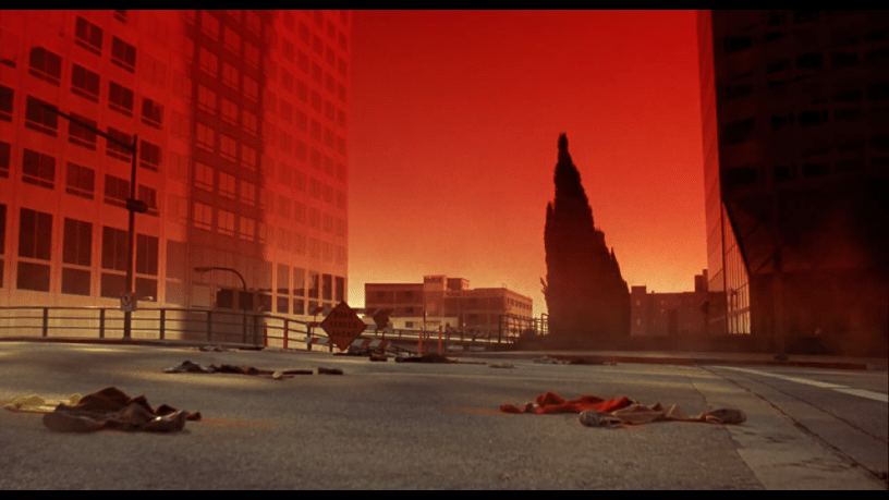 The next morning, we get some glimpses of the city. We don’t see any people, but we see piles of clothes with large amounts of some kind of dust surrounding them. It seems that everyone has been vaporized. But inside the projection booth, Regina and Larry seem fine. Larry is upset that his bootlegger contact hasn’t returned with the film.