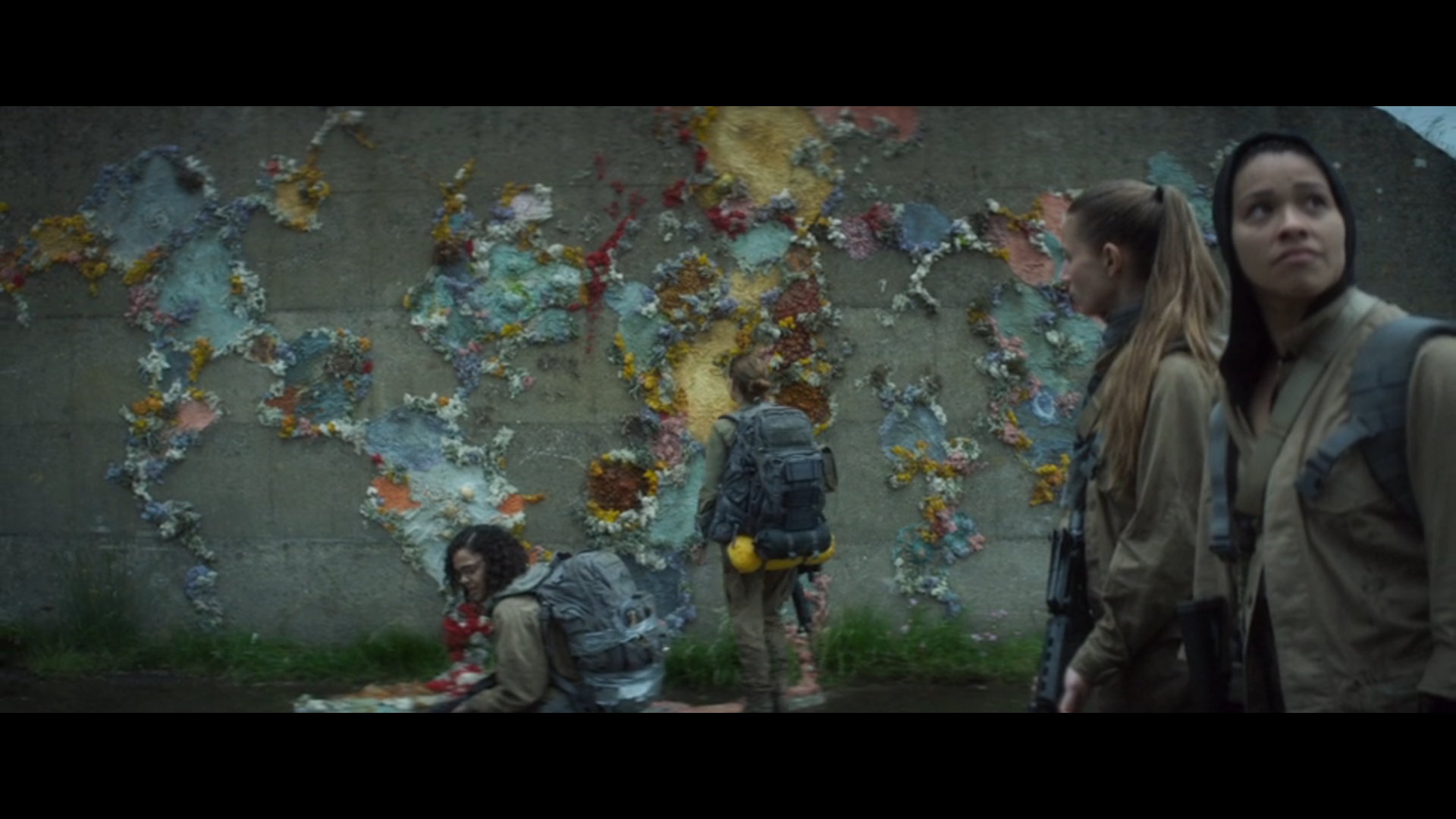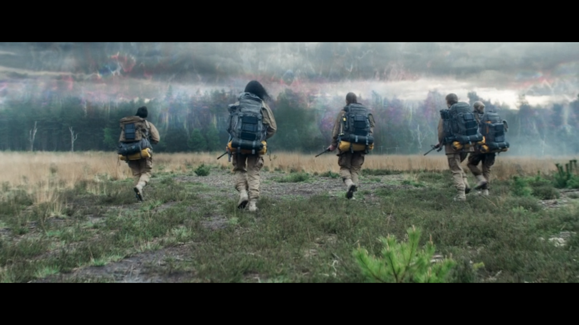 The film does a great job of getting us into the shimmer as soon as it can while setting the mood of the film. After another quick return to the interrogation scene, the 5 walk into the shimmer with their packs, along with high powered rifles.