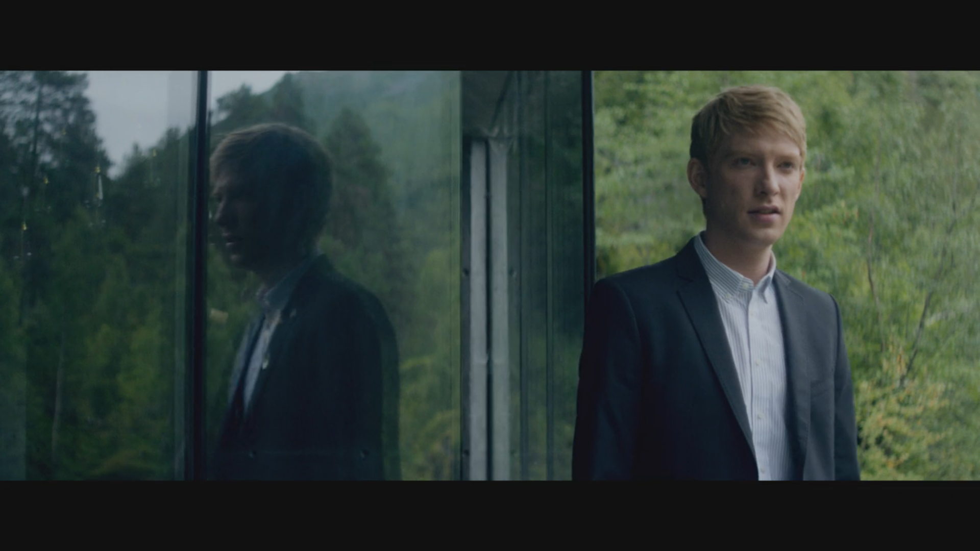 The film plays like a suspense thriller and it sets itself up right from the beginning. The first scene involves Caleb winning the contest at the company. As his co-workers congratulate him, we see brief shots of him through the eyes of cameras on his monitor and phone, implying that he is being watched. We get a quick leap forward as he’s immediately in a helicopter, flying to the compound. The pilot lands in an empty field, and Caleb is instructed that he has to walk several more miles in order to reach the actual building. There are no roads, or even paths, we see Caleb shoving aside branches as he moves through the forest. He finally comes across the compound, and when he is allowed in, he has to search for his host.