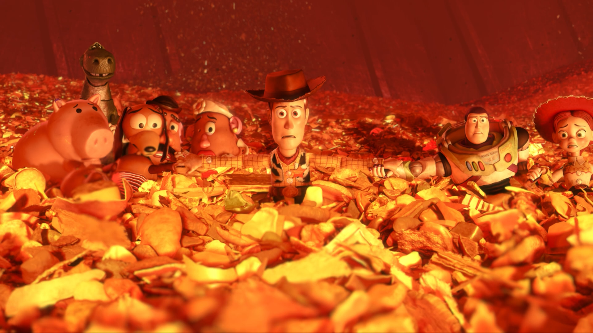 This leads to the last big setpiece of the film, at the town dump. This is where the film takes a really serious turn. The toys are thrown onto a conveyor belt leading to a shredder. They manage to get through that, but then find themselves on another conveyor belt leading to an incinerator.