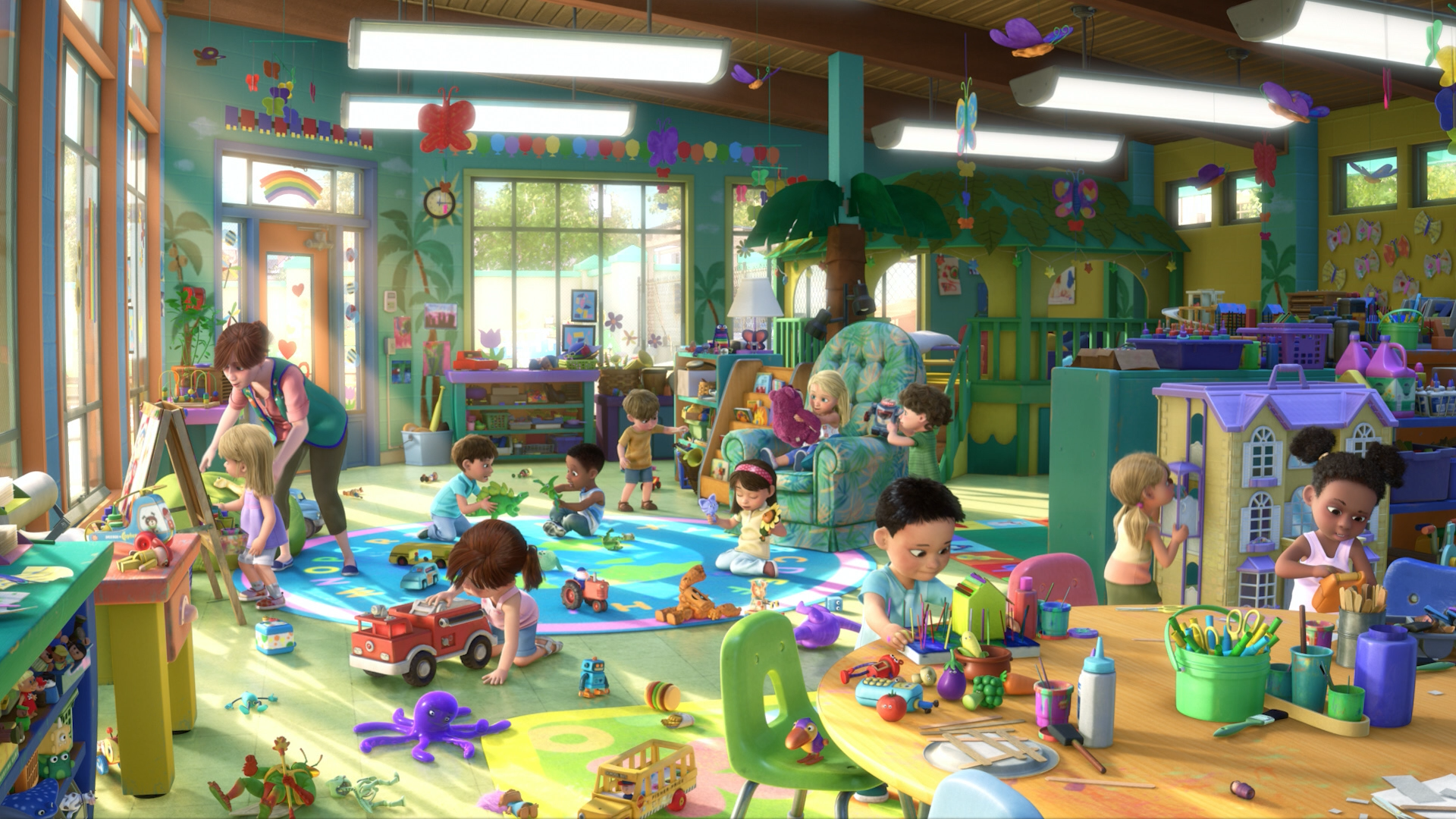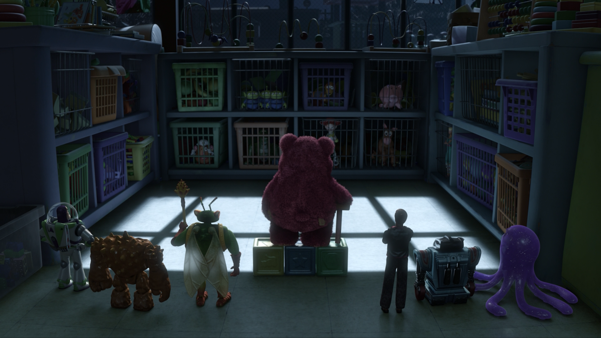 And when they arrive at Sunnyside, it seems like a toy paradise. They are met by Lotso Huggable Bear, an older toy, who assures them that at Sunnyside, the kids never get tired of them because every year there are new kids. And they take care of each other.